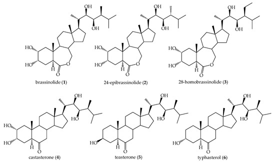 - Bajguz, A. Brassinosteroids—Occurence and chemical structures in plants. In Brassinosteroids: A Class of Plant Hormone; Hayat, S., Ahmad, A., Eds.; Springer: Dordrecht, The Netherlands, 2016; pp. 1–27. [Google Scholar]