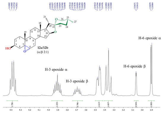 Epoxidation of diosgenin (6) originates a mixture of α- and β-epoxides with 95% yield. The diastereomeric ratio of each epoxide in the mixture was established by integration of 1H NMR signals assigned to the H-3 epoxide α (compound 12a) which in the mixture appear at δH = 3.95-3.86 ppm (multiplet) and H-3 epoxide β (compound 12b) which appear at δH = 3.73-3.65 ppm (multiplet), and H-6 epoxide β (compound 12b) at δH = 3.06 ppm (d, J = 2.3 Hz) and H-6 epoxide α (compound 12a) at δH = 2.90 ppm (d, J = 4.4 Hz) (Figure 2). Based on these NMR measurements the relative ratio of 12a:12b was determined as 2:1. Additionally, it was possible to assign most of the 1H and 13C NMR signals from the 12a/12b epoxide mixture.