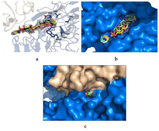 As can be seen in Figure 5a, the hydrophobic side chains of all carbamates are buried in the hydrophobic pocket delineated by residues I540, I563, W564, I592, Y597, L615 and T646. However, since these carbamates are larger than 1, they occupy a larger volume in the active site, and thus the phenyl groups slightly protrude out of the binding site (Figure 5b,c). Although it would seem reasonable that the phenyl group could also fit in the hydrophobic pocket, as has been reported for other analogs [50], the lack of functionalities that promote the interactions between both proteins and the carbamates in the inverted conformation, makes it unfavorable. This could be the reason for the modest activities determined for carbamates as compared to 1.