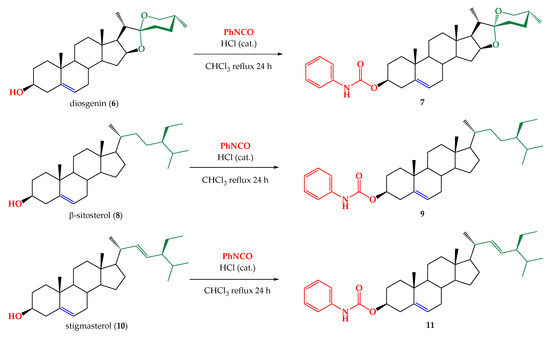 The synthesis of corresponding carbamates of diosgenin, β-sitosterol and stigmasterol was carried out by reacting these starting compounds with phenyl isocyanate, using CHCl3 as solvent and HCl as acid catalyst (Scheme 1) [38,39,40].