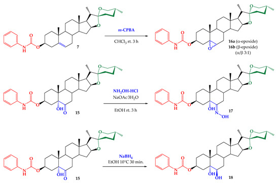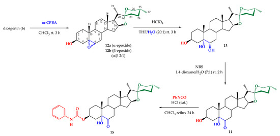 Synthesis of carbamate 15 from diosgenin goes through the intermediate 14 that is obtained by a three-step sequence including epoxidation of diosgenin with meta-chloroperoxybenzoic acid (m-CPBA) [41], acid-catalyzed epoxide opening [42], and selective oxidation of axial -OH group at position C6 with N-bromosuccinimide (NBS) [43] (Scheme 2).