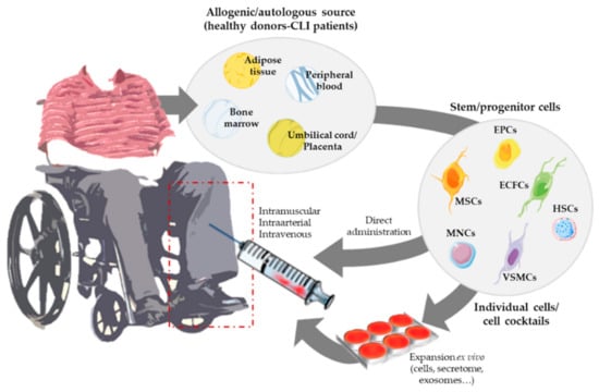 Despite the promising results derived from the use of stem cells with CLI patients, the variability and heterogeneity found within the clinical trials is high. Remarkably, after 20 years of using stem cell therapy in CLI, it remains unclear which cell type or cell source triggers the highest benefits in terms of blood perfusion recovery or amelioration of ischemic symptoms. The first trials focused on using heterogeneous cell preparations from either bone marrow of peripheral blood. Such unpurified cell mixtures are often composed by a considerably low proportion of “active” cells, or cells with documented pro-angiogenic functions [,,,]. On the other hand, large amounts of cells are required during cell therapy, but proangiogenic progenitor cells are not present in high proportions in humans, being necessary to develop optimized and clinically applicable culture expansion methods for future perspectives. Cells could be efficiently selected by their expression of CD34, CD133, or also by their ALDH-activity, although this approach have detractors too, as extended culture is thought to negatively affect cell regenerative function [,]. However, the optimization of these cultures could solve the problematic associated with EPCs or MSCs dysfunctionality in CLI patients, as well as augmenting the angiogenic potency of cells through pre-stimulation prior transplantation [,]. In this sense, the next question relies in whether using an autologous or an allogenic strategy with these patients. Autologous administration avoids rejection-related issues, but also presents several disadvantages such as difficulties to recruit a significant number of cells from these donors, and moreover the already mentioned cellular dysfunction in response to atherosclerosis and/or related co-morbidities. The allogenic method complicates the therapy applicability by requiring HLA-matching [,,].