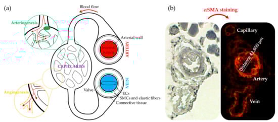 Mechanisms of neovascularization. (a) Schematic representation of the circulatory system in which angiogenesis and arteriogenesis processes are represented. (b) Representative immunohistochemistry image of blood vessels detected in the low back muscle of a CLI mouse [], to evaluate vascular density and diameter size using anti-smooth muscle α-actin (α-SMA, red) antibody.