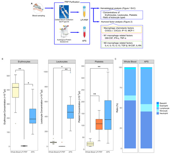 Purification and analyses of platelet-rich plasmas (PRPs) from two kits. (A) Flow of PRP purification and analyses. From each of the 12 healthy subjects, 120 mL of peripheral blood was collected and was added to 12 mL of anticoagulant citrate-dextrose solution. Leukocyte-poor PRP (LP-PRP) and Autologous Protein Solution (APS) were purified using their respective kits, and hematological analysis was performed immediately following purification. Humoral factor analysis was performed with frozen stored samples for various macrophage related factors. (B) Comparison of leukocyte, erythrocyte, and platelet concentrations in LP-PRP and APS. (C) Comparison of the ratios of leukocyte types in whole blood and APS. n = 12 PRP donors for each kit. * p < 0.05, ** p < 0.01.