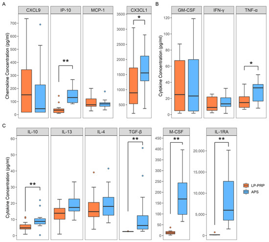 Analysis of humoral factors in PRPs. Comparison of concentrations of each factor in LP-PRP and APS. (A) Macrophage-recruitment factors (B) M1 macrophage related factors (C) M2 macrophage related factors. n = 12 PRP donors for each kit. * p < 0.05, ** p < 0.01.
