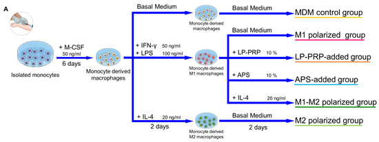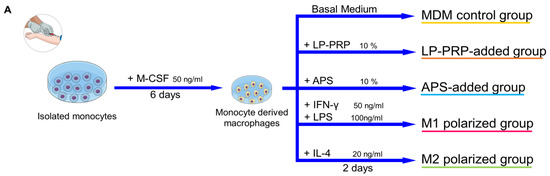 A summary of the process is shown in Figure 3A. Isolated monocytes were seeded at a density of 1 × 105 cells/cm2 on an Upcell Multi 24 well plate (CellSeed, Tokyo, Japan) containing basal medium supplemented with 20 ng/mL M-CSF (Peprotech, Rocky Hill, NJ, USA), and incubated at 37 °C, 5% CO2. After six days, the medium was replaced with medium with each of the following supplements: monocyte-derived macrophages (MDM control group)—basal medium; M1 polarized group—basal medium + 50 ng/mL IFN-γ (Peprotech) + 100 ng/mL lipopolysaccharides from Escherichia coli (LPS, Sigma-Aldrich); M2 polarized group—basal medium + 20 ng/mL IL-4 (Peprotech); LP-PRP-added group—basal medium + 10% LP-PRP; APS-added group—basal medium + 10% APS. PRPs were centrifuged at 16,139× g at 4 °C for 5 min to remove cellular components and the supernatants were used. The cells were cultured for another two days and then used for analysis. MDM control group: 6 monocyte donors, 5 experiments, total n = 30; LP-PRP- and APS-added groups: 6 monocyte donors, 12 PRP donors, n = 72 group; M1 and M2 polarized groups: 6 monocyte donors, 2 or 3 experiments, n = 14 per group.