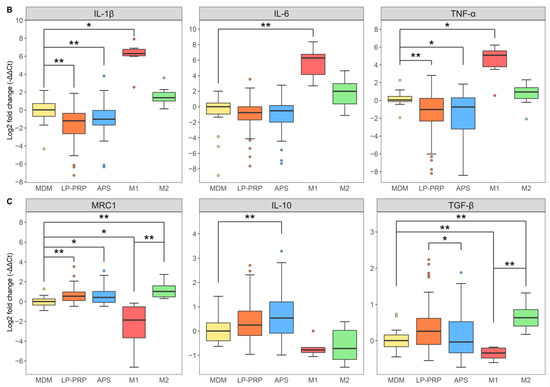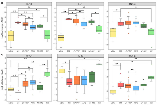 After six days, the medium was removed. Basal medium was added to MDM control group, and basal medium + 20 ng/mL IL-4 was added to M2 polarized group. Basal medium + 50 ng/mL IFN-γ + 100 ng/mL LPS was added to the other groups. All cells were cultured for two days, and then the medium was replaced by the following: MDM control, M2 polarized, and M1polarized groups—basal medium; M1-M2 polarized group—basal medium + 20 ng/mL IL-4; LP-PRP-added group—basal medium + 10% LP-PRP; and APS-added group—basal medium + 10% APS. PRPs were centrifuged at 16,139× g at 4 °C for 5 min to remove cellular components and the supernatants were used. After two days, the medium was removed, the cells were washed with DPBS, and the total RNA was collected using Isogen II reagent (Nippon Gene, Tokyo, Japan). MDM control, M1 polarized, M1-M2 polarized, M2 polarized groups: 6 monocyte donors, 1 experiment, n = 6 per group; LP-PRP- and APS-added groups: 6 monocyte donors, 12 PRP donors, n = 72 per group.