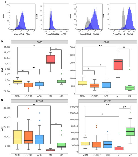 Flow cytometric analysis of M1/M2 macrophage cell surface markers. Cells were cultured under the same protocol as Figure 3. (A) A histogram representation of typical flow cytometry results. Gray and dashed lines: isotype control; blue and solid lines: signals for each antibody. Mean fluorescence intensity (MFI) values of each antibody were used to calculate ΔMFI values: ΔMFI = MFI Sample—MFI Isotype. (B) M1 macrophage markers. (C) M2 macrophage markers. MDM control group served as negative control, and M1 and M2 polarized groups served as positive controls. MDM control group: 6 monocyte donors, 5 experiments, n = 30; LP-PRP- and APS-added groups: 6 monocyte donors, 12 PRP donors, n = 72 per group; M1 and M2 polarized groups: 6 monocyte donors, 2 or 3 experiments, n = 14 per group. * p < 0.05, ** p < 0.01.