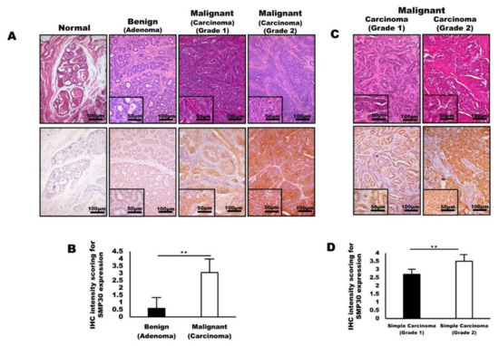 2.1. Elevated SMP30 Expression Levels in Mammary Tumors Correspond to Their Malignancy