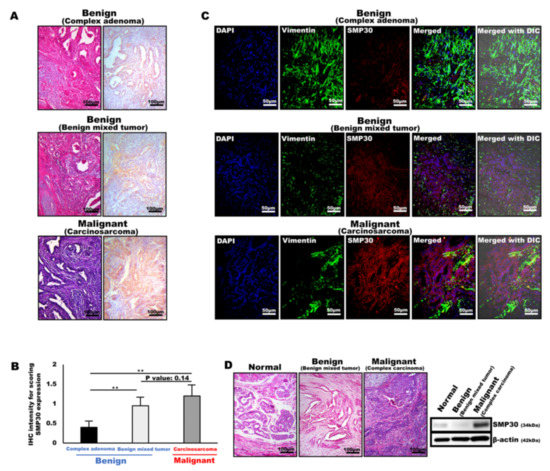 SMP30 was specifically expressed in neoplastic epithelial cells, especially in the cells with malignant rather than benign neoplastic epithelial cells. Immunohistochemistry and immunofluorescence were performed to confirm the origin cells of SMP30 expressions using different types of tumor tissues composed of complex origins of both mesenchymal and epithelial origin cells, such as benign mixed tumor, carcinosarcoma, and complex adenoma. Interestingly, SMP30 was not expressed in any of the myoepithelial cell origin components, whereas SMP30 was specifically expressed in proliferative neoplastic glandular epithelial cells (Figure 2A). Microscopically, complex adenoma was mainly composed of proliferative myoepithelial cells and well-differentiated glandular epithelial cells (Figure 2A). Immunohistochemically, the well-differentiated neoplastic glandular epithelial cells were very weakly positive for SMP30 (Figure 2A,B). The normal architecture of the mammary gland in the benign mixed tumor was diffusely replaced by neoplastic glandular epithelial cells accompanied by the proliferation of myoepithelial cells forming a mature bone. Although some of the neoplastic cells were pleomorphic and showed high cellularity with prominent nucleoli, most of the neoplastic glandular epithelial cells were well differentiated (Figure 2A). In immunohistochemical staining, SMP30 was expressed diffusely, distributed only in neoplastic glandular epithelial cells, but the intensity was not strong compared with that of the carcinosarcoma (Figure 2A,B). However, the positivity was higher than that of adenoma, consistent with higher cellularity, more prominent nucleoli, and more severe cellular pleomorphism than the cells of adenoma (Figure 2A,B). The SMP30 expression levels in carcinosarcoma were the strongest among the other types of tumors (Figure 2A,B). Although the major components of the tumor were proliferative myoepithelial cells, remnant neoplastic glandular epithelial cells showed prominent nucleoli, severe pleomorphism, and high cellularity accompanied by frequent mitotic figures, indicating poor differentiation levels (Figure 2A). SMP30 expression significantly increased in both carcinosarcoma and benign mixed tumor compared with complex adenoma (threefold for carcinosarcoma (p < 0.01), twofold for benign mixed tumor (p < 0.01)) (Figure 2B). Double staining was performed using two different antibodies, anti-SMP30 (red) and anti-vimentin (green), for myoepithelial cell markers to visualize the localization of SMP30 expression in tumor tissues (Figure 2C). SMP30 was not merged with vimentin, indicating that SMP30 was not expressed in any of the myoepithelial cells in complex adenoma, benign mixed tumor, and carcinosarcoma. Moreover, SMP30 expression increased with the malignancy of mammary neoplasia; complex adenoma was the lowest, benign mixed tumor was the second, and carcinosarcoma was the highest, which was the same pattern as the immunohistochemical results (Figure 2C). Western blot analysis was performed to compare SMP30 protein levels among normal, benign, and malignant tumors. For the benign tumor, benign mixed tumor was chosen. In contrast, complex carcinoma sample was used for malignant mammary gland tumor. Microscopically, the pleomorphism of the glandular epithelial cells was minimal in benign mixed tumor, whereas the glandular epithelial cells in complex carcinoma showed prominent nucleoli and severe pleomorphism (Figure 2D). In accordance with the histopathological features, SMP30 protein was weakly detected in normal mammary glands. Moreover, the SMP30 protein level of complex carcinoma was the highest in western blot analysis. However, the SMP30 protein level in benign mixed tumor was significantly lower than that of complex carcinoma, indicating that SMP30 protein was rarely expressed in well-differentiated glandular epithelial cells (Figure 2D). In accordance with protein levels, SMP30 mRNA levels were significantly higher in carcinoma than in normal mammary gland (Figure S2, Supplementary Materials).