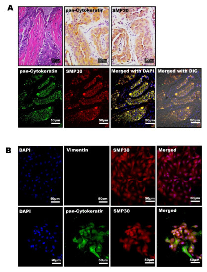 The Histostain® Plus Broad Spectrum Kit (Cat#859043, Life Technologies, Carlsbad, CA, USA) was used for immunohistochemistry. For antigen retrieval, deparaffinized serial tissue sections were treated with 3% hydrogen peroxide diluted in methyl alcohol at room temperature for 35 min and heated in citrate buffer (pH of 6.0) for 30 min. To prevent nonspecific reactions, the sections were treated with a blocking solution (Cat#859043, Life Technologies, Carlsbad, CA, USA) at room temperature for 1 h. Then, the sections were incubated at 4 °C overnight with primary antibody rabbit anti-SMP30 (1:200, Cat#SML-ROI001-EX, Cosmo Bio Co., Ltd., Tokyo, Japan), and mouse anti-pan-cytokeratin (1:200, Cat#ab86734, Abcam, Cambridge, UK). The sections were washed 3 times using phosphate-buffered saline (PBS) and reacted with broad-spectrum secondary antibody (Cat#859043, Life Technologies, Carlsbad, CA, USA) and with horseradish peroxidase (HRP)-conjugated streptavidin (Cat#859043, Life Technologies, Carlsbad, CA, USA) for 10 min. Finally, the reactions were visualized using a 3,3-diaminobenzidine (DAB) peroxidase substrate kit (Cat#SK-4100, Vector Laboratories, Inc., Burlingame, CA, USA), followed by counterstaining with hematoxylin for 30 s.