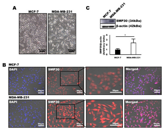 SMP30 protein expression is significantly stronger in a poorly differentiated human breast cancer cell line, MDA-MB-231. (A) Representative images of human breast cancer cells, MCF-7 and MDA-MB-231. Scale bars = 100 μm. (B) Representative immunofluorescence images of SMP30 expressed in MCF-7 and MDA-MB-231. MDA-MB-231, which is a poorly differentiated mammary carcinoma cell line, was characterized by a significantly stronger SMP30 protein expression than that of MCF-7, which is a well-differentiated mammary carcinoma cell line. Scale bars = 50 μm. (C) Protein levels of SMP30 and β-actin were assessed by western blot analysis in MCF-7 and MDA-MB-231. SMP30 expression was significantly higher in MDA-MB-231. (* p < 0.05)