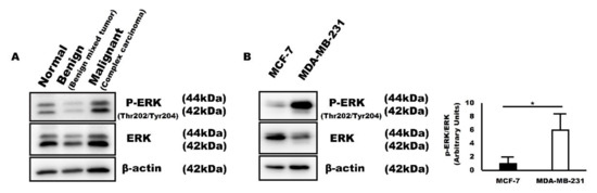 p-ERK protein expression is consistent with SMP30 in canine mammary gland tumors and human breast cancer cell lines, MCF-7 and MDA-MB-231. (A) p-ERK expression levels were low in normal mammary gland and benign mammary gland tumor, whereas they were high in malignant tumor. (B) p-ERK expression levels increase with malignancy in cancer cells. (* p < 0.05).