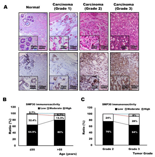 2.6. SMP30 Expression Levels in Human Breast Cancer Tissues and Its Correlation with Age and Histopathological Grades of Carcinomas