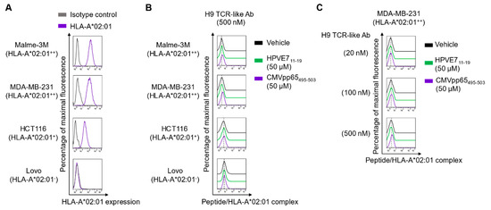 Evaluation of H9 binding to the cell surface-displayed CMVpp65495-503/HLA-A*02:01 complex. (A) Flow cytometric analysis of the cell surface expression levels of human leukocyte antigen (HLA)-A*02:01, classified as + + (high level) for both MDA-MB-231 and Malme-3M cells, as + (positive) for HCT116 cells, and as ‒ (negative) for LoVo cells. (B,C) Flow cytometric analysis of H9 binding at 500 nM (B) to peptide-pulsed cells (B) and at various concentrations to peptide-pulsed MDA-MB-231 cells (C). Cells were pulsed with the vehicle, CMVpp65495-503 peptide (50 μM), or the control HLA-A*02:01-restricted HPVE711-19 (50 μM) peptide for 3 h at 37 °C and incubated with H9 and then the Alexa Fluor 647-conjugated goat anti-mouse immunoglobulin G (IgG)-specific (Fab’)2 antibody (Ab) (secondary Ab) prior to flow cytometry. In (A–C), representative histograms from two independent experiments are depicted.