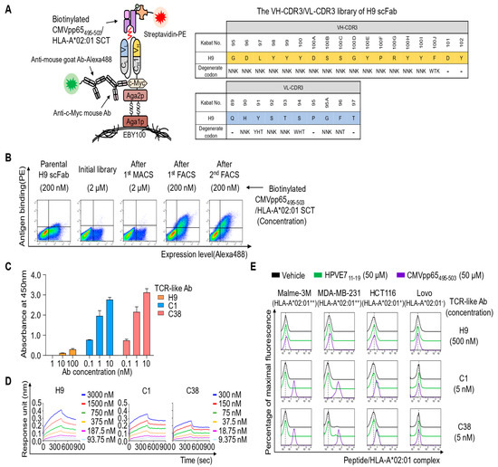 Previously, a TCR-like Ab (H9) specific for the CMVpp65495-503/HLA-A*02:01 complex was reported [13]. However, the affinity was relatively weak (KD = 300 nM), limiting its potential use as a detection or therapeutic reagent. Here, we aimed to engineer H9 to increase its affinity by ~67-fold for pMHC comprising the CMVpp65495-503/HLA-A*02:01 complex by yeast surface display (YSD) technology, thereby enabling highly sensitive and specific detection of the cell surface-displayed pMHC.
