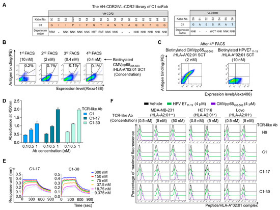 Affinity maturation of C1 Ab to generate high-affinity TCR-like Abs. (A) The scheme of yeast scFab library construction for VH-CDR2 and VL-CDR2 of C1 Ab, wherein the indicated residues were randomized with the indicated degenerate codons. The “‒” sign indicates conserved residues. (B) Flow cytometric sorting gate plots of the yeast surface-displayed scFab library screening in each round of screening by FACS with the indicated concentration of the biotinylated CMVpp65495-503/HLA-A*02:01 SCT antigen in the presence of a 10-fold higher concentration of the non-biotinylated off-target HPVE711-19/HLA-A*02:01 SCT protein. (C) Flow cytometric analysis of target-specific enrichment for the yeast surface-displayed scFab library pool enriched after four rounds of FACS using the indicated target and off-target antigen. (D) Dose-dependent binding activity of the isolated and purified Abs in mouse IgG2a/κ form toward the microtiter plate coated with pMHC comprising CMVpp65495-503/HLA-A*02:01 complex antigen, as determined by ELISA. (E) Binding isotherms of the immobilized IgG2a/κ Abs toward the soluble CMVpp65495-503/HLA-A*02:01 complex antigen, as measured by biolayer interferometry. The concentrations of pMHC are indicated (colored). The kinetic interaction parameters are listed in Table 1. (F) Flow cytometric analysis of binding of the TCR-like Abs in IgG2a/κ form at the indicated concentrations to peptide-pulsed cells. Cells were pulsed for 3 h at 37 °C with the vehicle, CMVpp65495-503 peptide (4 μM), or the control, HLA-A*02:01-restricted HPVE711-19 (4 μM) peptide, and incubated with the TCR-like Abs at the indicated concentrations and then with the Alexa Fluor 647-conugated goat anti-mouse IgG-specific (Fab’)2 Ab (secondary Ab) prior to flow cytometry. Representative histograms from two independent experiments are depicted.