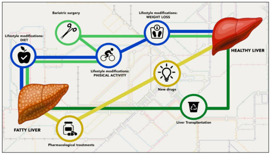 Current proposed treatments for non-alcoholic fatty liver disease (NAFLD) and its advanced forms. Although specific therapies for NAFLD are not approved yet, general strategies have been proposed to manage it, including: (a) lifestyle change (blue line), (b) glucose-lowering agents (including pioglitazone), or antioxidants (such as vitamin E), or other promising drugs (yellow line), (c) bariatric surgery in patients with severe obesity (i.e., BMI > 35 kg/m2) (light green line), and (d) liver transplantation in selected cases (dark green line).