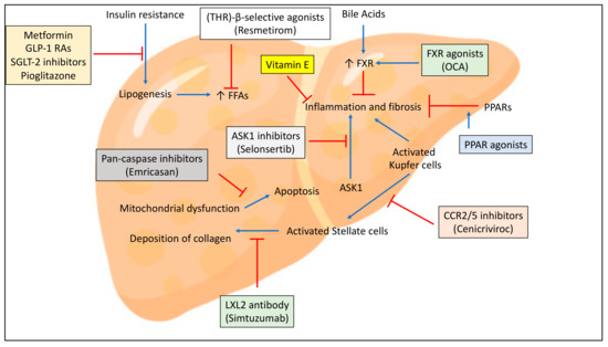 Main medications against NAFLD and its advanced forms and their mechanisms of action. See text for details. Note: Blue lines correspond to signal activation; red lines correspond to signal block. Abbreviations: ASK-1, apoptosis signal-regulating kinase-1; FFA, free fatty acids; FXR, farnesoid X receptor; GLP-1 RAs, glucagon-like peptide-1 receptor agonists; LOXL-2, lysyl oxidase-like 2; OCA, obeticholic acid; PPAR, peroxisome proliferator activated receptor; SGLT-2, sodium-glucose co-transporter-2; THR, thyroid hormone receptor.