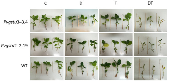 Effect of heat (T), drought (D) and combination of drought and heat (DT) stress on the growth of transgenic lines (Pvgstu3–3.4 and Pvgstu2–2.19) and wild-type (WT) tobacco plants after 9 days compared to the stress-free, control (C) conditions. It is interesting that under single D or T stresses did not show any significant wilting as compared to the DT treatment.