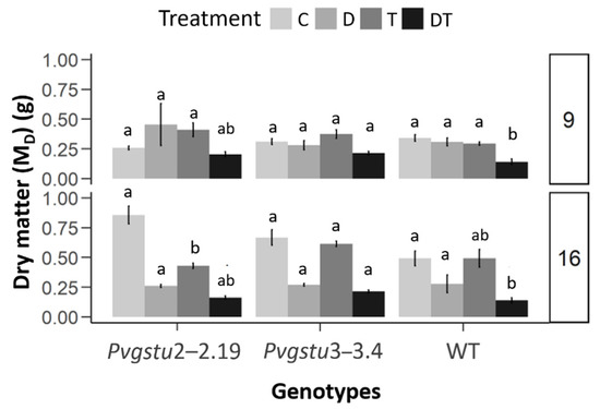 Dry matter (MD) (g) of the transgenic lines Pvgstu3–3.4 and Pvgstu2–2.19 and WT plants growing under control (C), drought (D), heat (T) and combination of drought and heat stresses (DT) at nine and 16 days. Different letters indicate significant differences among genotypes for each treatment at p < 0.05. Data are means ± SE (WT: n = 4; Pvgstu lines at 9 days: n = 5; at 16 days: n = 7).