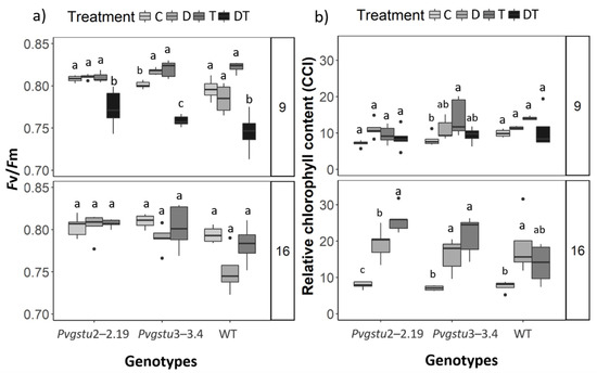 Physiological measurements: (a) maximum fluorescence (Fv/Fm) of photosystem II and (b) relative chlorophyll content (CCI) measured in the transgenic lines Pvgstu3–3.4 and Pvgstu2–2.19 and WT plants growing under control (C), drought (D), heat (T) and combination of drought and heat stresses (DT), at nine and 16 days. Different letters indicate significant differences among treatments for each genotype at p < 0.05. Data are means ± SE (WT: n = 4; Pvgstu lines at 9 days: n = 5; at 16 days: n = 7).