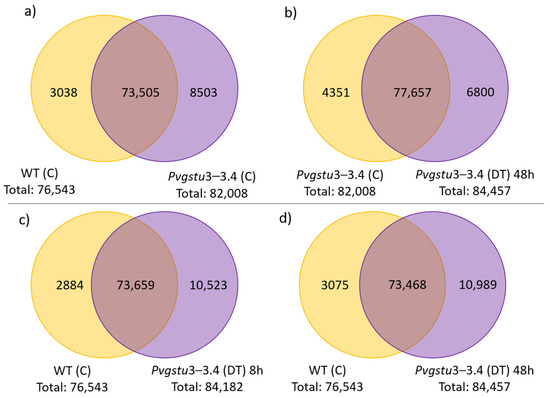 The differentially expressed genes (DEGs) were selected according to the standard of p< 0.05, and the false discovery rate (FDR) was set to 0.001 to determine the threshold of the p-value for multiple tests. The absolute value of |log2Ratio| ≥ 1 was used to determine the difference between the gene expression transcription group and the database. Analysis of the DEGs between the stress-free (control conditions) WT and transgenic plants (group 1 vs. group 2) showed that there are 73,505 commonly expressed DEGs, 8503 unique DEGs expressed in Pvgstu3–3.4 and 3038 in WT (Figure 4a). However, when the combined DT stress was applied, we observed that Pvgstu3–3.4 under control conditions compared to 48 h under combined DT stress (group 2 vs. group 4) had more commonly expressed DEGs (77,657), 4351 unique DEGs for Pvgstu3–3.4 in stress-free conditions and 6800 for Pvgstu3–3.4 at 48 h under DT stress (Figure 4b). A slight increase in the uniquely expressed DEGs (10,989) was observed in Pvgstu3–3.4 at 48 h under DT stress (Figure 4d) compared to 10,523 after 8 h under DT stress (Figure 4c), which were greater than the uniquely expressed DEGs of stress-free Pvgstu3–3.4 (Figure 4a). After comparing the commonly expressed genes between stress-free conditions (Figure 4a), 8 h under DT stress (Figure 4c) and 48 h under DT stress (Figure 4d), we observed an increase of 154 commonly expressed DEGs at 8 h (Figure 4c) and a decrease of 37 commonly expressed DEGs at 48 h under DT stress (Figure 4c) compared to the stress-free conditions (Figure 4a).