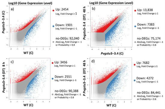 Scatter plot depicting the correlation of the gene expression profiles between (a) WT vs. Pvgstu3–3.4 in stress-free control (C) conditions (0 h; groups 1 vs. 2, respectively); (b) stress-free Pvgstu3–3.4 (C) vs. Pvgstu3–3.4 at 48 h under DT (groups 2 vs. 4, respectively); (c) stress-free WT (C) vs. Pvgstu3–3.4 at 8 h under DT (groups 1 vs. 3, respectively).; (d) stress-free WT (C) vs. Pvgstu3–3.4 at 48 h under DT (groups 1 vs. 4, respectively). DT indicates combined drought and heat stresses. The significantly up- and downregulated genes with probability ≥ and ≤ 0.8, respectively, are presented with red and blue dots, respectively, while non-significant genes as gray dots.