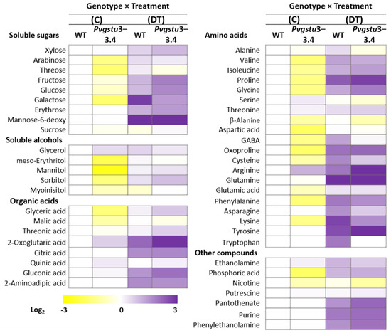 Heat map of primary metabolites of Pvgstu3–3.4 and WT plants under combined DT stress (9 days) compared to control conditions. For each metabolite, the ratio between DT treatment to control was transformed into log2 and depicted with a color scale indicated as purple (increase) and as yellow (decrease; see color scale). Mean values of three independent determinations for each treatment were expressed as relative abundance compared to internal standard adonitol and are reported as background-free of the control conditions at 0 days. Actual data are provided in Supplementary Table S6.