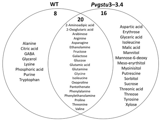 Overexpression of the Pvgstu3–3.4 had a significant effect on the metabolic profile of transgenic plants under nonstressed conditions as indicated by the 23 out of 50 metabolites being significantly different from the WT plants, 20 of which were downregulated and only three were upregulated (Table 4; Figure 6). The metabolites that were downregulated were mainly soluble sugars (five), such as sucrose, fructose and glucose, amino acids (nine), such as valine, proline, oxoproline, the soluble alcohols mannitol, sorbitol and myo-inositol and the organic acids malic and glyceric acid.