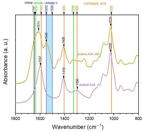 An IRAffinity-1S Fourier transform infrared spectrometer (Shimadzu, Kyoto, Japan) provided with a quest-ATR unit and a diamond crystal was used to investigate the chemical composition of ADA-GEL and ADA samples. A total of 40 scans per spectrum at a resolution of 4 cm−1 were recorded in absorbance mode with Happ-Genzel apodization, to obtain attenuated total reflectance Fourier transform infrared (ATR-FTIR) intensity spectra. Prior to the measurements, all samples were frozen at −20 °C for at least 24 h and afterwards lyophilized for 24 h using a freeze-dryer (ALPHA 1−2 LDplus, CHRIST Gefriertrocknungsanlagen).