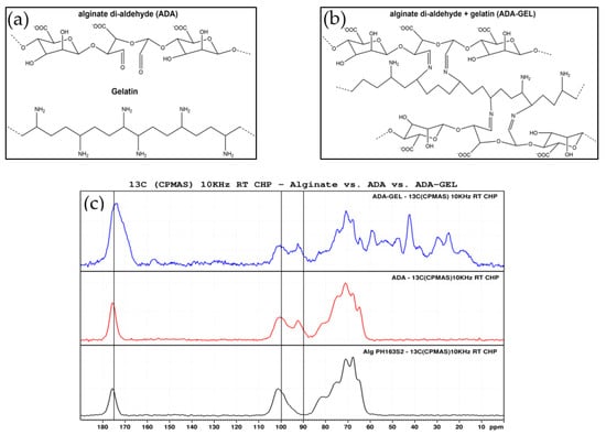 Schematic depiction of (a) ADA and gelatin separately and (b) ADA-GEL structure formed via Schiff base bond formation. (c) Solid state 13C NMR spectra of ADA-GEL, pristine ADA and alginate (from top to bottom).