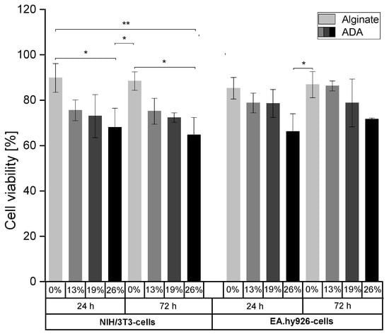 Cell viability of NIH/3T3- (left) and EA.hy926-cells (right) embedded in alginate and ADA hydrogels (%DO: 13–26%) after incubation for 24 h and 72 h. * p < 0.05, ** p < 0.01.