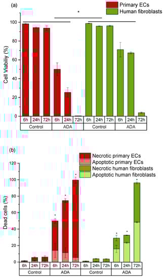 Time-dependent comparison of primary endothelial cells (ECs) and fibroblasts grown in ADA. (a) Cell viability (DiI-positive cells); (b) apoptotic populations in total death cluster (DiI-negative, PI-negative staining) and necrotic populations in total death cluster (DiI-negative, PI-positive staining). Control: cells with DCFH-DA grown on plastic. * p < 0.05 indicates significant differences between the groups in cell viability (a) and number of apoptotic cells (b).