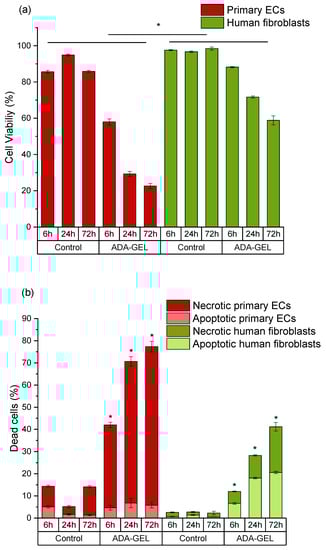 Time-dependent comparison of primary ECs and fibroblasts grown in ADA-GEL. (a) Cell viability (DiI-positive cells); (b) apoptotic populations in total death cluster (DiI-negative, PI-negative staining) and necrotic populations in total death cluster (DiI-negative, PI-positive staining). Control: cells with DCFH-DA grown on plastic. * p < 0.05 indicates significant differences between the groups in cell viability (a) and number of necrotic cells (b).