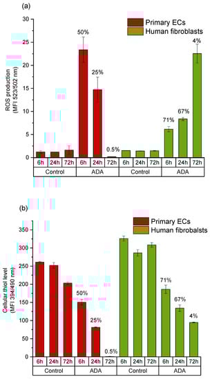 As shown in Figure 4 and Figure 5, the cytotoxic effect of ADA (13% DO) on human ECs was confirmed in the present study. An extremely strong ROS generation resulting in a rapid depletion of cellular thiols was observed already after 6 h of incubation, which reduced the amount of viable cells by 50 %. In contrast, less pronounced effects of ADA were noted in human fibroblasts, whereby the ROS generation at 6 h was lower than in ECs, and the viability was reduced by 30%. This result can be related to the higher cellular thiol content of fibroblasts, which has been previously reported by Lorenz et al. []. and was also confirmed in our study. Compared to primary ECs, fibroblasts consistently showed a much higher baseline thiol level in all measurements performed with comparable numbers of control cells. High antioxidant capacity of primary human fibroblasts was previously reported in relation to their resistance against mild oxidative stress and explains how these cells could escape the growth arrest by extending the replicative life span []. A major difference between ECs and fibroblasts was also observed in terms of correlation between ROS production and the cellular thiol levels. The correlation observed in fibroblasts reflects the natural response of healthy and robust cells to oxidative stress, whereby gradually increasing ROS production leads to the depletion of thiols, in order to limit or prevent the oxidative damage. A different effect was observed in ECs grown in ADA, as the massive oxidative assault leads to survival of only 50% of cells within merely 6 h. In these conditions, only the cells which still have relatively high thiol content can remain viable despite very high ROS levels. Similar was seen after 24 h, whereby only 25% ECs remained viable, which was presumably the most robust part of the total cell population, still containing the sufficient level of thiols. As nearly all ECs were dead at 72 h, only negligible levels of ROS or thiols were measurable at that time point.