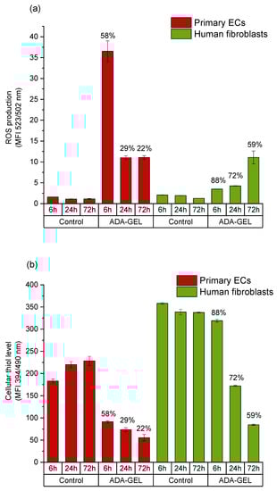 Comparison of intracellular ROS levels and cellular thiol levels in primary ECs and fibroblasts grown in a time dependent manner in ADA-GEL. (a) Mean value of DCF emission detected by flow cytometer; (b) intracellular thiol content of cells under the same conditions. Results obtained in the same cell population with MBB staining and mean value of emission are presented. Cell viability at respective time points is indicated over the columns. Control: cells with DCFH-DA grown on cell culture plastic.