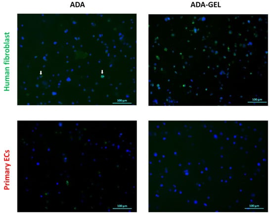Immunofluorescence staining of proliferating cells (green channel) after 72 h of incubation. Representative images show Ki-67 expression in primary ECs and human fibroblast grown in ADA and ADA-GEL. Nuclei: Hoechst (Blue), Ki-67: Alexa Fluor 488 (green). The white arrows indicate scarce fibroblasts in ADA positive for Ki-67.