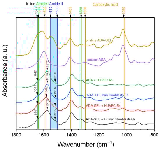 Figure 9 shows FTIR spectra of hydrogel samples that were separated from cells after 6 h of incubation in comparison to pristine ADA and ADA-GEL. Due to the fact that 24 h and 72 h samples showed similar characteristics to the 6 h samples, they were excluded to simplify the graph. All samples obtained from cell culture seem to show similar characteristics at first sight (Figure 9). In comparison to pristine ADA, new peaks or shoulders of the dominant C=O asymmetric peak of carboxylic acid can be found in the region of N-H stretching vibration of amide II (1500–1550 cm−1) []. This points to the presence of amide II in all cell culture samples, thus indicating the presence of gelatin or other proteins. As the samples “ADA + Human fibroblasts” and “ADA + HUVECs” did not contain any proteins in the first place, the FTIR spectra indicate that serum proteins which are suspended in the cell culture medium are present inside the hydrogel during culturing. In addition, a small shoulder at 1647 cm−1 can be observed, which can be attributed to Schiff base formation []. However, one can observe that absorptions in the region of the amide II and imine peaks are much lower when comparing the spectra of the cultured samples to those of pristine ADA-GEL. This leads to the assumption that considerable amounts of gelatin used for ADA-GEL preparation have already been released after 6 h of incubation. It is assumed that this gelatin release refers to the amount of excessive gelatin, which is not cross-linked via a Schiff base bond. On closer examination, a slight tendency to more distinct amide II (1516 cm−1) and imine (1647 cm−1) peaks in ADA-GEL samples can be observed in comparison to ADA samples.