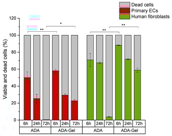 Comparison of cell viability between primary ECs and fibroblasts grown in ADA versus ADA-GEL. * p < 0.05, ** p < 0.001.