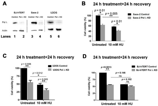 Pol λ was silenced in the telomerase-negative cell line Saos-2 (Figure 1A, lanes 3, 4; Figure S3), which uses the ALT mechanism to elongate its telomeric DNA ends. As shown in Figure 1B, silencing of Pol λ alone already significantly reduced cell viability, compared to controls. A similar reduction in viability was observed in control cells after stalling replication forks with HU treatment for 24 h, followed by 24 h of recovery, to allow for replication fork restart, in order to highlight failure in overcoming replication stress (Figure 1B). Combination of HU treatment with Pol λ silencing resulted in an additional loss of viability, suggesting that the effects of HU-induced replication stress were worsened by the absence of Pol λ. In a similar experiment, silencing of Pol λ in U2OS ALT cells (Figure 1A, lanes 5, 6; Figure S4) reduced cell viability similarly to HU treatment. However, combination of Pol λ silencing and HU treatment caused a further reduction in viability (Figure 1C), as observed with Saos-2 cells and according to previous observations []. In BJ-hTERT cells, which use telomerase-dependent elongation of the telomeric DNA ends, silencing of Pol λ was effective (Figure 1A, lanes 1, 2) and reduced cell viability (Figure 1D), to a similar extent as HU treatment alone. However, contrary to what has been observed on ALT cell lines, a combination of Pol λ silencing with HU treatment did not result significantly in further loss of viability (Figure 1D).