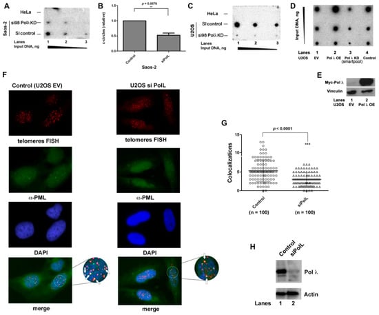 The levels of DNA polymerase λ correlate with the cellular ALT activity. (A) Dot blot assay for c-circle formation. Different amounts of amplified c-circle DNA from HeLa (top lane) or Saos-2 cells, either silenced for Pol λ (mid lane) or treated with scrambled control (bottom lane), were spotted on a membrane and hybridized with a radioactive telomeric probe. (B) Quantification of c-circles in SI control vs. Pol λ KD Saos-2 cells. Values are the mean of three independent experiments, each comprising three different amounts of DNA as in panel A. Error bars are ± S.D. The χ2 p value is shown on top. **, χ2 p value < 0.01. (C) As in panel A, but with c-circle DNA amplified from HeLa cells (top lane) or U2OS cells, either silenced for Pol λ (bottom lane) or treated with scrambled control (mid lane). (D) Dot blot assay for c-circle formation. Different amounts of amplified c-circle DNA from U2OS cells transfected with the empty vector (EV, lane 1), U2OS cells overexpressing Pol λ (OE, lane 2), U2OS cells silenced for Pol λ (KD, lane 3) or untreated U2OS cells (Control, lane 4), were spotted on a membrane and hybridized with a radioactive telomeric probe. (E) Western Blot analysis showing the levels of Pol λ in U2OS cells transfected with the Pol λ expression vector (corresponding to Pol λ OE of panel C). EV, U2OS cells transfected with the empty vector as negative control. (F) Confocal microscopy imaging of colocalization of PML protein (green) and telomeres (red) in U2OS cells either silenced for Pol λ (right panels) or control (left panels). Nuclei were stained with DAPI (blue). Representative colocalization events are indicated by white arrows. (G) Statistical analysis of three independent experiments comparing the number of colocalization events in control and silenced cells (n. of cells = 100 for each condition). The number of colocalization events observed within a single cell is shown for control (circles) and silenced (triangles) cells. χ2 p value is shown on top (***, χ2 p value < 0.0001). (H) Western Blot analysis showing the levels of Pol λ in U2OS cells either transfected with scramble control siRNA (lane 1) or anti-Pol λ siRNA (lane 2).