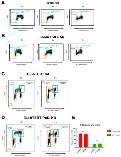 Finally, the effects of Pol λ silencing on the cell cycle in ALT cells. As shown in Figure 3A,B, silencing of Pol λ in U2OS cells resulted in an accumulation of cells in late S-G2 phases compared to the scrambled control at the 9 h time point (28.59% vs. 17.67% respectively), with a concomitant reduced number of cells progressing to the G1 phase of the next cycle (36.41% vs. 44.55%, respectively). On the other hand, silencing of Pol λ in BJ-hTERT immortalized fibroblasts, which are telomerase proficient, did not result in a significant delay in the cell cycle (Figure 3C–E). This suggested that silencing of Pol λ resulted in a slower progression through late S-G2 phases, specifically in ALT cells.