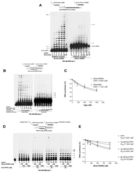 Since TERRA RNA can be used as a primer by Pol λ, we next asked whether and to what extent its presence could interfere with the DNA-primed MMST DNA synthesis. To this aim, competition experiments were carried out on the 48/48mer bubble template, either in the presence of fixed-labeled 26mer DNA and increasing amounts of unlabeled 26mer TERRA (Figure 5B, lanes 4–8), or with a fixed labeled 26mer TERRA primer and increasing amounts of unlabeled 26mer DNA (Figure 5B, lanes 12–16). Both unlabeled competitors (either RNA or DNA) were able to reduce MMST synthesis by Pol λ (Figure 5B, compare lanes 2, 3 and 10, 11 with lanes 4–8 and 12–16, respectively) with similar affinities (Figure 5C). The POT1/TPP1 complex was able to increase the rate of the DNA-primed MMST reaction by Pol λ. Consistently, the presence of POT1/TPP1 reduced the ability of TERRA to inhibit the DNA-primer MMST reaction (Figure 5D, compare lanes 2–6, with lanes 7–21) in a dose-dependent manner (Figure 5E).