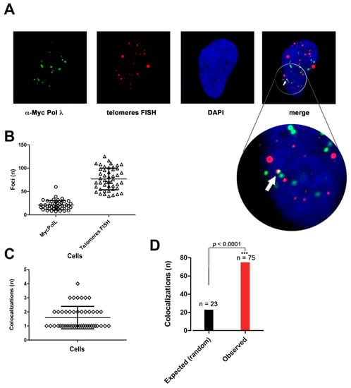 The interaction of Pol λ with telomeric DNA was investigated by immunofluorescence analysis and confocal microscopy on Saos-2 cells, stably expressing ectopic Myc-tagged Pol λ and on U2OS cells. Saos-2 cells were synchronized in S-phase by a low dose of HU and then released for 6 h before analysis, in order to enrich the population of late S-phase cells. Figure 6A shows an example of colocalization of telomeric DNA, detected by telomere-specific FISH, and Pol λ foci, detected by α-Myc Abs. A total of 62 cells were analyzed, corresponding to 1254 Pol λ foci and 4830 telomeric-positive foci, respectively (Figure 6B). Since we observed only between 1 to 3 colocalization events per cell (Figure 6C), we performed a statistical analysis comparing the number of colocalization events observed vs. those predicted to occur under the hypothesis of a random distribution of foci, which indicated that the colocalization was statistically significant (Figure 3D).