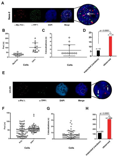 Moreover, the same analysis was performed on endogenous Pol λ in unsynchronized U2OS cells. Figure 7E shows an example of endogenous Pol λ and TPP1 colocalizations. A total of 3461 TPP1 foci (range 29–42/cell) and 2550 Pol λ foci (range 1–103/cell) were detected (Figure 7F). In this case, we observed a higher number of colocalization events per cell (Figure 7G). Once again, statistical analysis under random distribution hypothesis revealed effective colocalization of the two factors (Figure 7H).