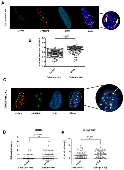 Telomere dysfunctions can induce DNA damage at telomeres, which results in the appearance of foci of DNA damage response proteins such as P53BP1 at telomeres. Thus, we investigated whether silencing of Pol λ in ALT cells was sufficient to induce such telomere dysfunction-induced foci (TIFs). To this aim, colocalization of TPP1 with P53BP1 was analyzed by confocal microscopy in Saos-2 and U2OS cells either wt or treated with Pol λ-specific siRNA. Figure 8A,C show examples of colocalizations between P53BP1 and TPP1 respectively in Saos-2 and U2OS cells silenced for Pol λ (Pol λ KD). In both ALT cell lines, as shown in Figure 8B,D, Pol λ deficiency results in a statistically significant higher number of TIFs containing both P53BP1 and TPP1, with respect to wt cells. When a similar analysis was performed on BJ-hTERT cells, which use telomerase-dependent elongation of the telomeric DNA ends, no statistically significant difference between wild type and Pol λ KD cells was observed (Figure 8E).