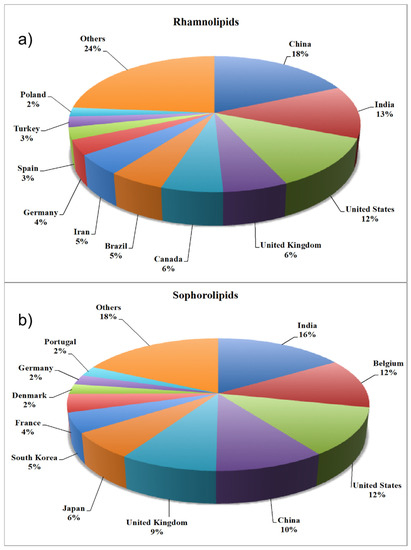On the other hand, Figure 2 shows the distribution of publications about rhamnolipids (Figure 2a) and sophorolipids (Figure 2b) by country. Surprisingly, Figure 2 is not in consonance with Figure 1, where the USA was the dominant country in terms of microbial biosurfactant production. Regarding microbial biosurfactant research, China and India currently lead the ranking, accounting for 18% and 16% of total published studies to date on rhamnolipids and sophorolipids, respectively.