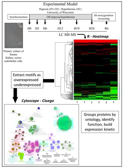 Experimental model and analysis strategy. Primary human renal glomerular endothelial cells (HRGEC) were synchronized and were subjected to cold-ischemia like conditions: incubation in a hermetic chamber at 4 °C containing a hypoxic atmosphere: 0% O2, 5% CO2, and 95% N2 for up to 24 h (Hypothermic/Hypoxic period, H), in University of Wisconsin solution, then washed and incubated in regular culture conditions (Reperfusion period, R). At each time point, cell monolayers were collected for analysis. After LC-MS/MS analysis, a heatmap was generated to distinguish protein motifs by their variation, and each group was analyzed using Cytoscape’s ClueGO to identify their ontology and network associations.