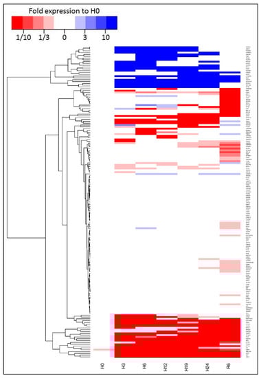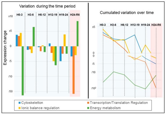 1—In response to the drastic changes in conditions, important de novo expression was taking place within the cell (H0–H3). This increase was not found afterward, however, the level was maintained for a certain duration. After a certain time period, protein expression collapsed. Interestingly, all three ontologies showing this pattern did not show the same kinetic. The first to start decreasing was the Transcription/Translation Regulation: as soon as 3 h were passed, the expression level tends to decrease, a trend which worsened over time. The ionic balance regulation maintained its higher expression levels until 12 h, then collapsed. The Cytoskeleton was the last to collapse, starting at H19. This pattern was also characterized by a further lowering of protein expression levels at reoxygenation.
